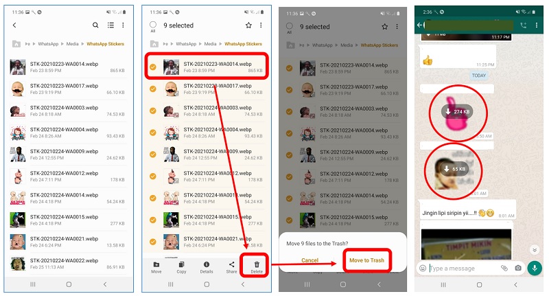 - Tap Delete atau icon Tempat Sampah. Pilih opsi Move to Trash. Tunggu beberapa detik seluruh file WhatsApp Sticker dibuang.