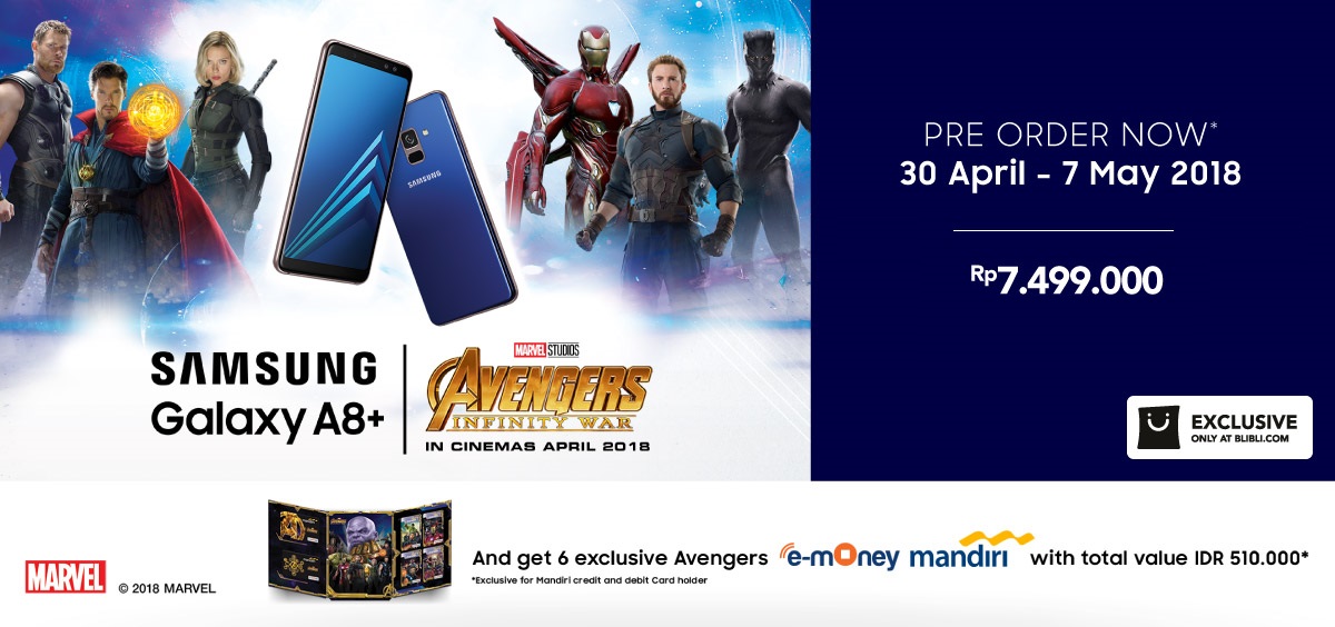 Terdapat dua varian Samsung Galaxy A8+ yang mendapatkan promo di Blibli.com, yakni Samsung galaxy A8+ Blue Edition dan Samsung Galaxy A8+ Blue Marvel’s Avengers: Infinity War Exclusive.