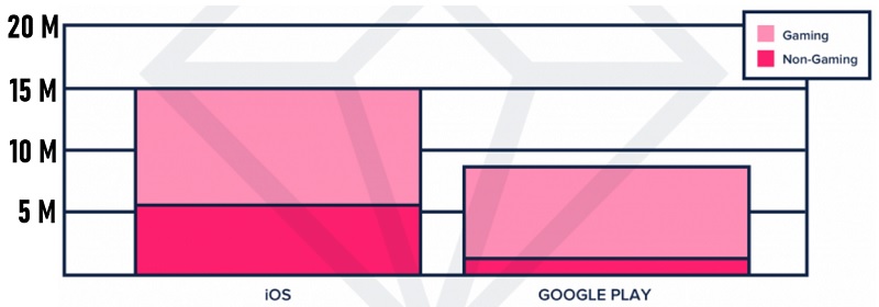 Di Google Play, aplikasi non-game menyumbang 55 persen dari semua unduhan, sementara di iOS angkanya sedikit lebih tinggi yaitu 65 persen.