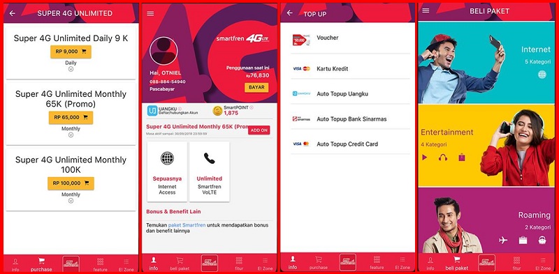 Selanjutnya, Anda bisa menggunakan berbagai fitur yang ditawarkan di aplikasi My Smartfren. Misalnya saja mencek kuota tersisa Anda, melakukan pembelian atau top up secara langsung, Bahkan banyak program promosi yang ditawarkan.
