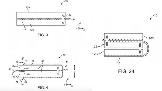“Engselnya mungkin dikonfigurasi untuk membuat layar fleksibel bisa berhadap-hadapan atau membelakangi.”, tulis deskripsi paten itu.