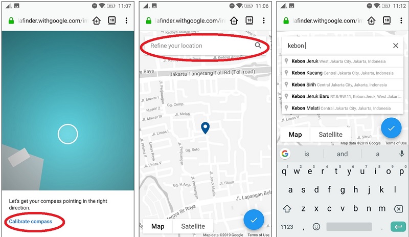 Oh ya, untuk menggunakan aplikasi ini, smartphone Anda harus tersedia sensor kompas. Pastikan tersedia. Jika sudah ada lakukan kalibrasi lebih dahulu agar titik kordinat pencarian tak meleset. Biasanya dengan memutar smartphone membentuk angka delapan. Sebenarnya Anda bisa gunakan lokasi berada secara otomatis, tetapi juga bisa menginput lokasi dengan manual. Ketika nama lokasi Anda saat ini. Tap lingkaran biru (tanda V).