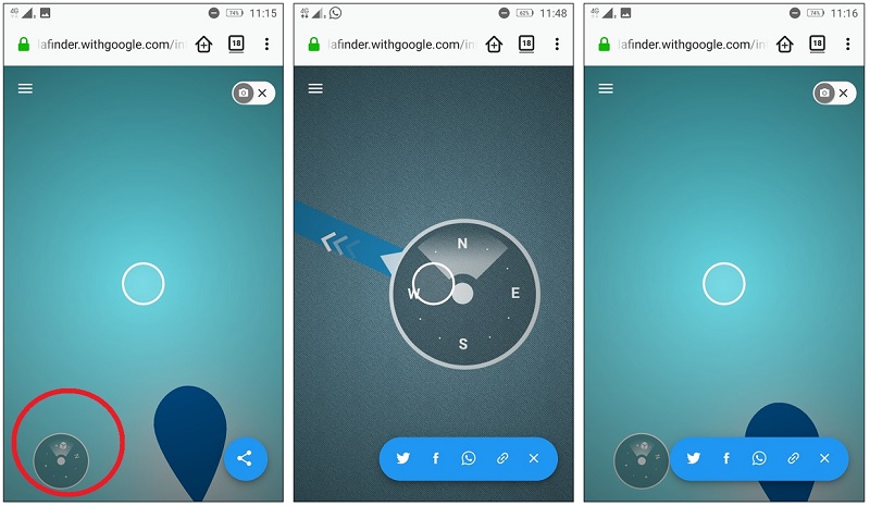 Mulanya akan muncul kompas berukuran kecil di bawah. Letakkan smartphone dengan posisi stabil. Maka akan muncul tanda kompas besar. Nah, muncul panah arah Kiblat. Sehingga sebelum salat, Anda bisa memastikan meletakkan sajadah. Anda juga menggunakan kamera (aktifkan ikon kamera) untuk menambahkan POI. Jika ingin berbagi lokasi dan arah tekan saja tanda biru, akan muncul beberapa ikon media sosial.