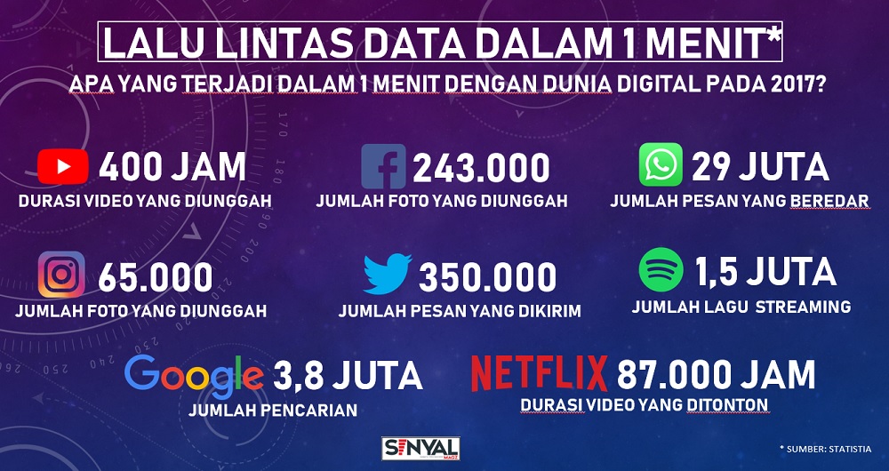 Statistia mencoba menghitung dan menyederhanakan seperti apa sibuknya traffic data yang beredar di dunia sepanjang 2017. Statistia mengolah dan membuat rata-rata kemudian menyajikan dengan hitungan durasi selama 60 detik alias satu menit.