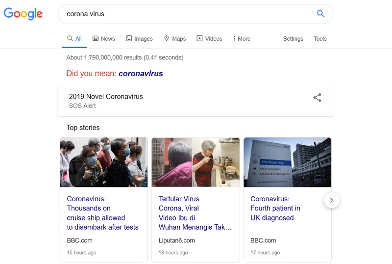 Jadi ketika orang mencari informasi tentang virus Corona di Google, maka akan muncul berbagai hal seputar kabar terbaru yang tentu saja sahih dan benar. Kemudian di dalamnya –jika Anda scroll- maka akan hadir berbagai tips dan panduan.