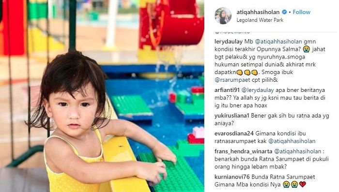 Netizen ramai-ramai berkomentar di unggahan akun Instagram Atiqah yang di-publish memperlihatkan Salma anaknya sedang berenang menggunakan baju berwarna kuning lima hari lalu.
