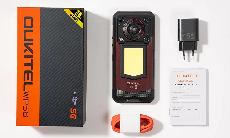 Spesifikasi tambahannya mencakup MediaTek Dimensity 7050 SoC yang dipasangkan dengan memori 12 GB, penyimpanan flash 512 GB, dukungan 5G, pengisian daya kabel 45 W. Oukitel WP56 telah memakai OS Android 15.