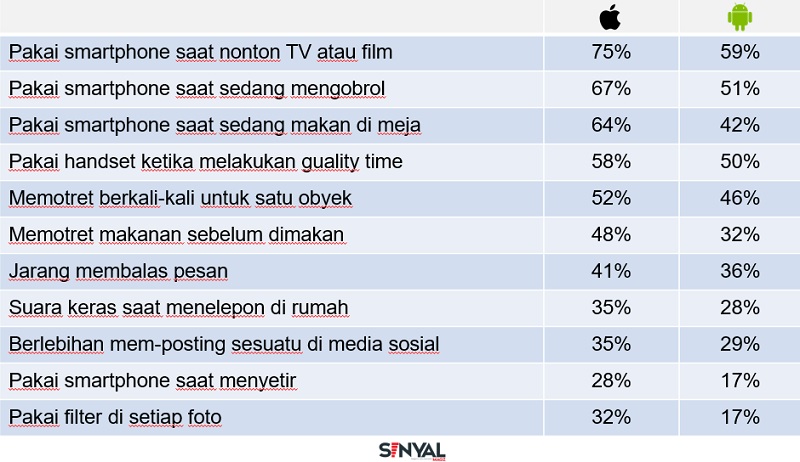 Jika dibandingkan kebiasaan antara pemilik iPhone dengan Android, di seluruh kebiasaan menunjukkan bahwa beberapa hal yang “buruk” banyak terjadi di pengguna iPhone.