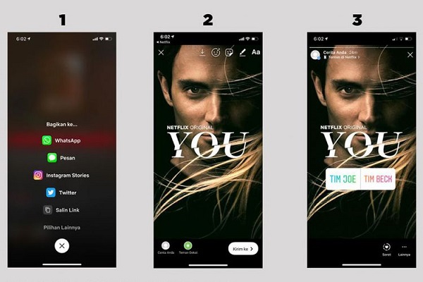 Dalam keterangan resminya, Rabu (23/1/2019), cara untuk berbagi rekomendasi ini terbilang mudah. Pelanggan tinggal masuk ke aplikasi Netflix, pilih judul film yang ingin dibagi. Lalu klik opsi “Share”, dan pilih “Instagram Stories”.