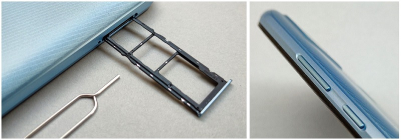 Realme Narzo 20 yang unibody menyiapkan tiga slot masing-masing untuk dua nano SIM card dan sebuah untuk microSD.