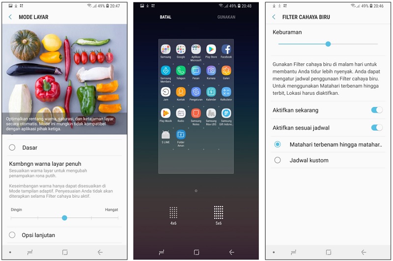 Setingan pada layar menampilkan beberapa pilihan. Misalnya saja Mode Layar, matriks menu (4×6 atau 5×6), tentu saja tak ketinggalan filter cahaya biru. Opsi terakhir ini dapat disetel mengikuti jam. Ketika malam hari membuat mata Anda lebih nyaman menghadap layar.