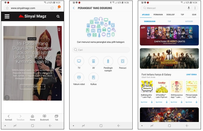 Samsung punya browser bertajuk Internet yang fiturnya cukup lengkap, mulai Bookmark, Tab, Share, pengaturan ukuran teks di web, mode malam, riwayat unduhan dan sebagainya.