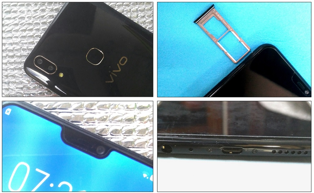 Earpiece dan kamera selfie tepat berada di tengah atas alias dibagian poni. Agaknya vivo belum menyediakan LED flash untuk keperluan swafoto.