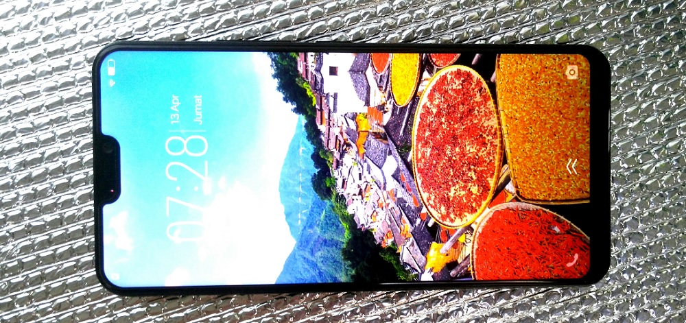 Layar tersebut menempati space penampang depan hingga 85 persen lebih. Pola bezeless dengan menyisakan sisi samping yang sangat tipis, 1,75 mm. Layar berukuran diagonal 6,3 inci bermutu FHD+. Resolusinya 1080 x 2280 pixel, jenis IPS LCD. Memang tak dilapis oleh Gorilla Glass, sebagai gantinya dipasang screen protector.