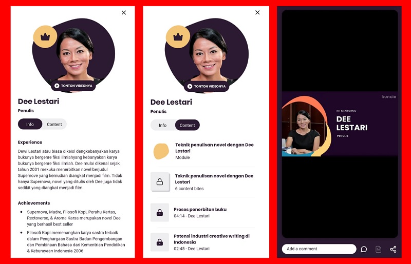 Kuncie menampilkan kilasan biodata setiap instruktur. Bagi yang belum kenal di informasi ini Anda bisa mengenali lebih lanjut. Setelah cukup info, Anda tinggal tap menu Content. Interface yang Anda temui berupa ragam materi yang ditawarkan oleh instruktur.