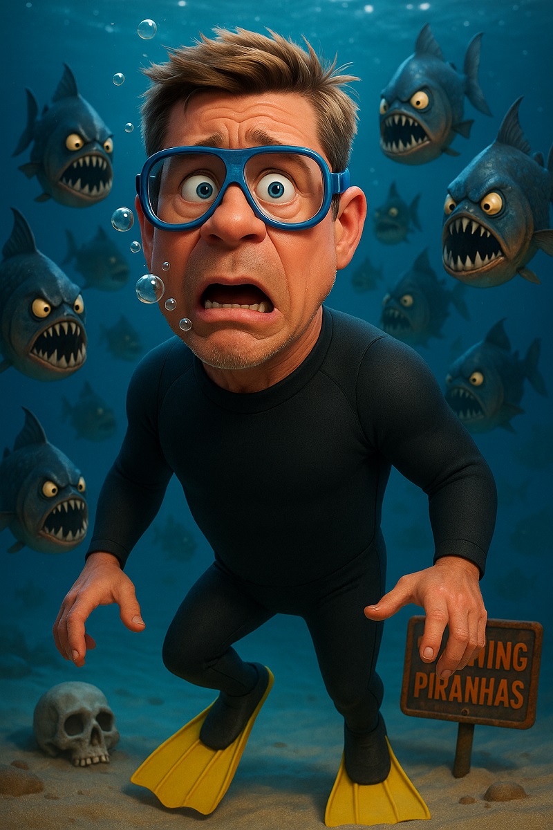 The character is underwater, wearing a tight-fitting black wetsuit, yellow fins, and blue goggles, surrounded by a school of aggressive piranhas with sharp teeth and glowing eyes. He has a facial expression of surprise and fear, with bubbles rising from his mouth to the surface.