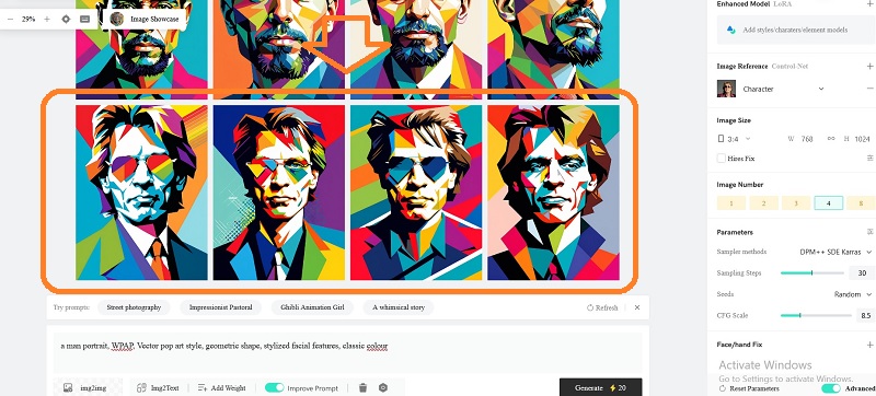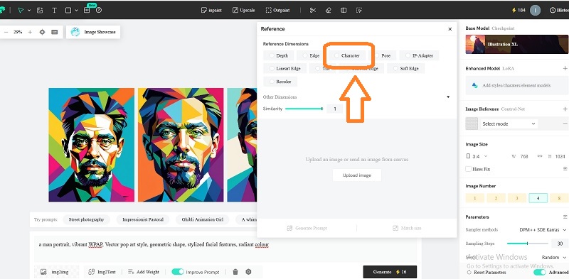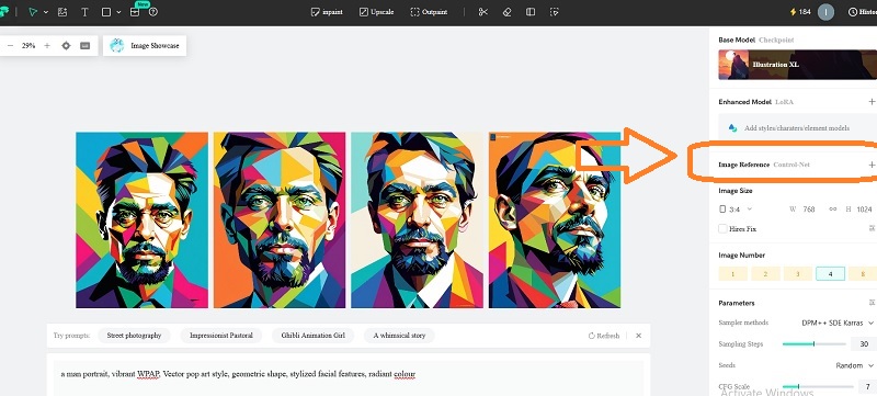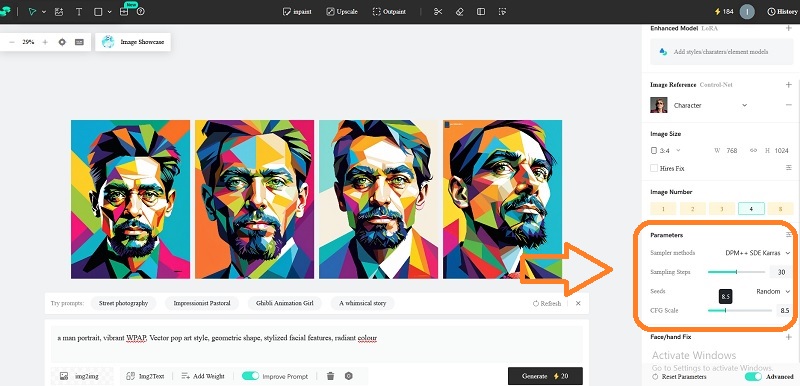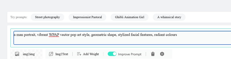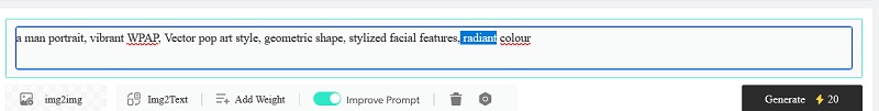 Selanjutnya ketik prompt sebagai berikut; a man portrait, vibrant WPAP vector pop art style, geometric shape, stylized facial features, radiant colour. Lalu klik GENERATE.