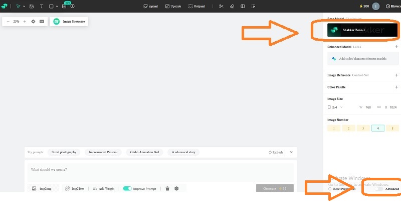Selanjutnya akan muncul tampilan seting Shakker AI. Mari mulai dengan memindahkan ke opsi ADVANCED (kanan bawah). Lalu klik SHAKER, lalu pilih ILUSTRATION XL.
