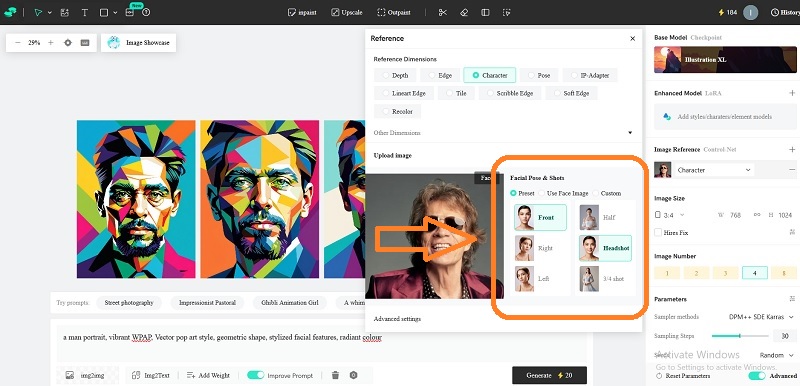 Pada kotak Facial Pose & Shots pilih PRESET, lalu klik FRONT dan HEADSHOT.