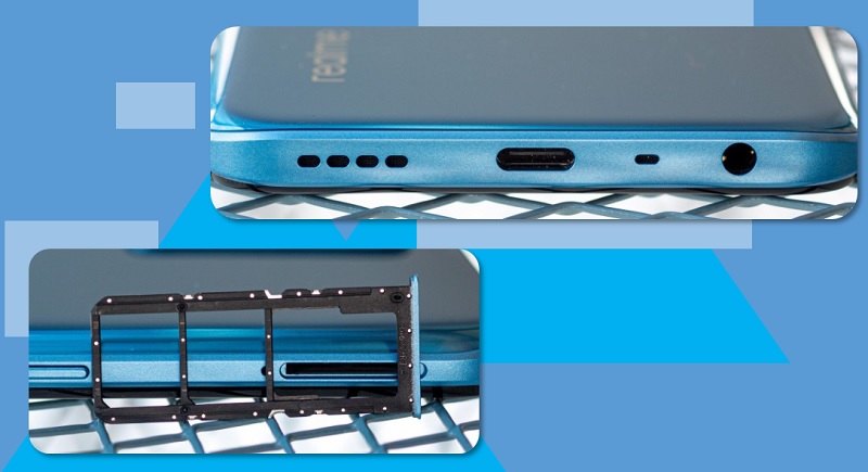 Bagian bawah Realme 8 5G (atas), slot 2 kartu SIM dan microSD (bawah)