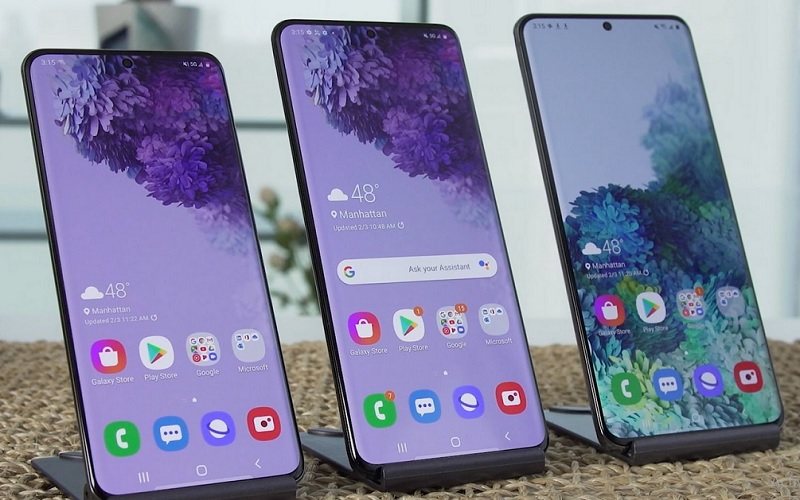 Samsung Galaxy S20 (kiri) bersama dua anggota keluarga Galaxy S20 lainnya.