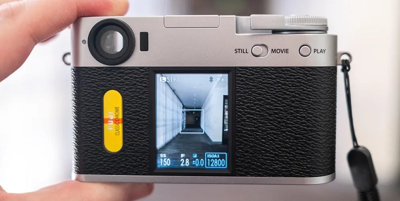 Bagian belakang kamera dilengkapi dua layar LCD: layar utama berukuran 2,4 inci dengan rasio aspek 3:4 yang dioptimalkan untuk komposisi vertikal, serta layar sekunder kecil (sub-LCD) yang menampilkan informasi seperti mode filmsimulation yang sedang digunakan.