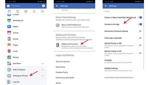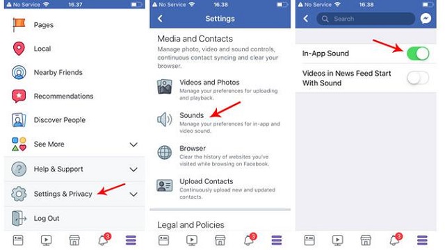 Setelah itu, klik Settings > Media and Contacts, dan tekan tombol “Sounds in The App” ke posisi Off.