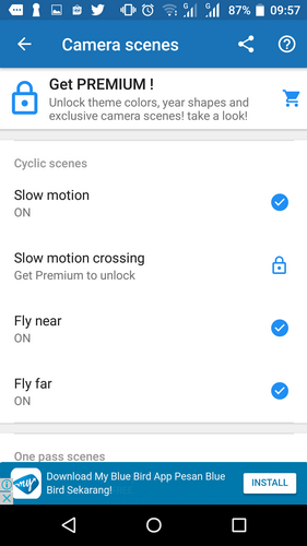 Efek yang tersedia pada kamera cyclic scenes mencakup slow motion, fly near dan fly far yang ketiganya bisa diaktifkan secara bersamaan atau dipilih salah satu saja. Sementara efek slow motion crossing hanya tersedia pada versi premium.