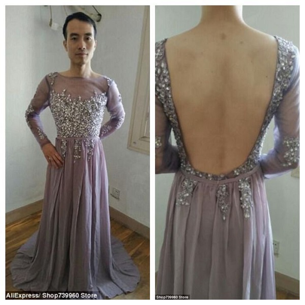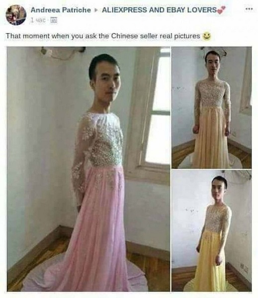 “Saya menemukan sebuah toko yang menjual gaun prom dan gaun pengantin. Jadi saya meminta foto asli daripada stok foto dan penjual mengirimi saya (foto) dari dia untuk mencobanya.”, tulis sang pembeli.