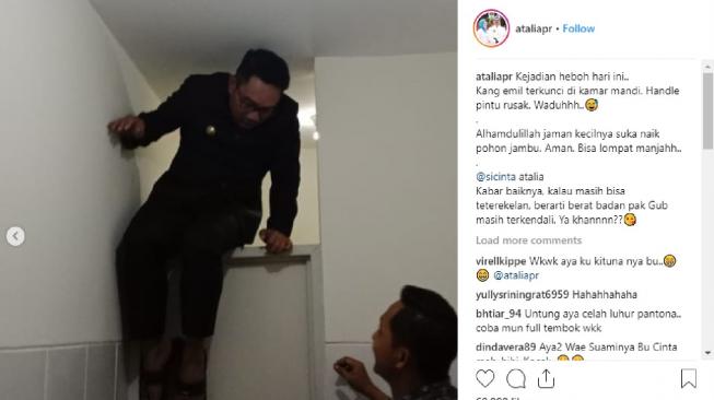 Kang emil terkunci di kamar mandi. Handle pintu rusak. Waduhhh..😅”, tulis Atalia dalam postingannya.