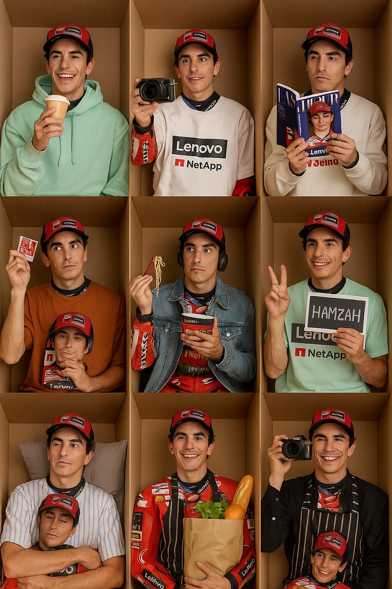 Buat kolase fotorealistik berisi 9 bingkai dalam susunan 3×3 vertikal (rasio 9:16, resolusi 8k). Setiap bingkai menampilkan orang dari foto referensi persis sama (pertahankan 100% wajah asli, warna kulit, proporsi, serta cara mereka memegang produk, tanpa mempercantik atau mengubah produk). Tempatkan orang tersebut di dalam kotak kardus sederhana dengan tekstur cokelat polos.
