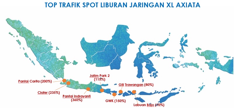 Area-area lokasi wisata popular yang mengalami lonjakan trafik antara lain Pantai Carita sebesar 200%, GWK Bali 150%, dan Gili Trawangan Lombok sebesar 80%. Di Labuhan Bajo, trafik layanan data juga mengalami kenaikan sebesar 10%, Ciater Jawa Barat 235%, Pantai Indrayanti Yogyakarta 360 % serta Jatim Park 2 Malang sebesar 115%.