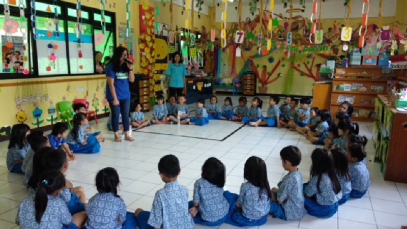 Karyawan XL Axiata sedang mengajar murid-murid PAUD Cakung Barat terkait dengan Program Karyawan Mengajar PAUD dan TK.
