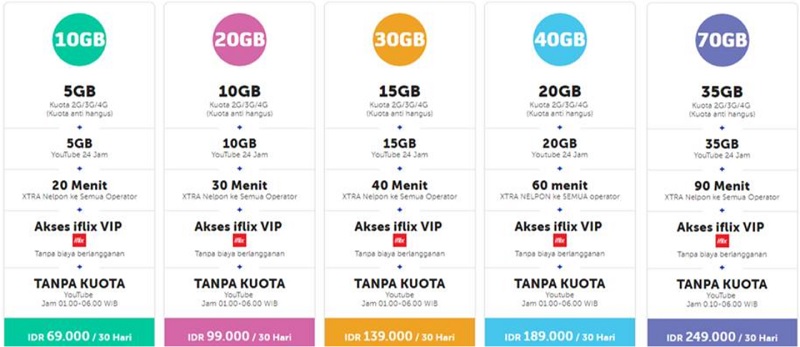 - Manfaat ketiga, memberikan nilai lebih dalam penyediaan konten tambahan yang relevan. Manfaat yang bisa pelanggan peroleh berupa akses ke iFlix VIP tanpa biaya berlangganan. Selain itu, masih ada manfaat tambahan lainnya, yaitu berupa streaming YouTube tanpa kuota di jam 01:00 s/d 06:00, serta Xtra Nelpon ke semua operator berlaku 24 jam.